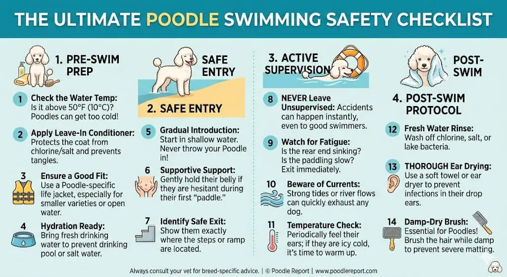 - For New Swimmers: Focus on Phase 2 (Safe Entry). Poodles are highly intelligent but can be cautious; a positive first experience is key to a lifetime of aquatic confidence.