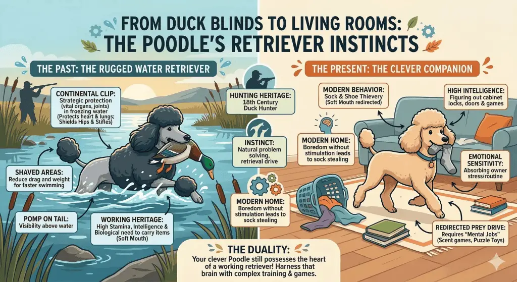 While your modern Poodle might never see a duck blind, that intense working heritage is still hardwired into their DNA. According to the American Kennel Club’s history of the breed, they are true water retrievers, which translates into two very specific household behaviors you must be prepared for.