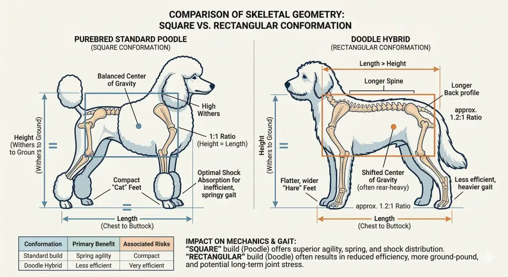 Doodles often inherit a “rectangular” geometry because most breeds they are crossed with possess longer backs designed for different types of pulling or carrying work. Doodles tend to have a heavier, more flat-footed walk compared to the light, suspended trot of a Poodle. According to basic canine structural science, a well-proportioned, square frame is naturally more efficient at distributing weight evenly over the joints.