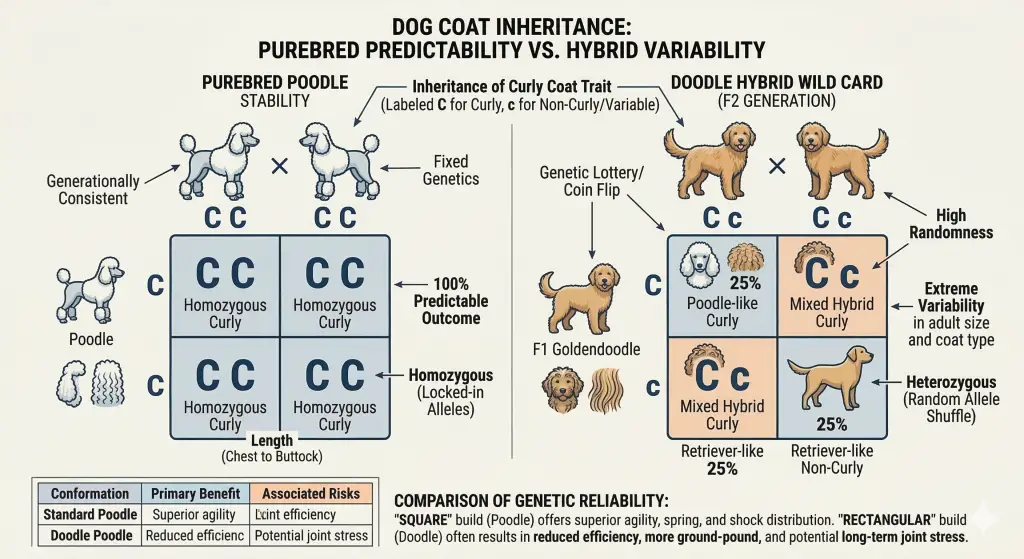 - The Predictability Factor: Purebred Poodles are a “fixed” breed with stable, highly predictable genetics. Doodles are a first-generation hybrid, meaning their adult size, coat type, and temperament are always a genetic lottery.