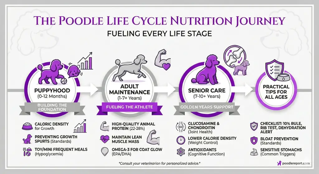 As Poodles enter their “Golden Years” (around age 8–10), their metabolism slows. Senior diets should feature lower calorie density to prevent obesity, which is the primary enemy of aging joints. This is the life stage where Glucosamine and Chondroitin become essential additives to help manage wear and tear on the hips and knees.