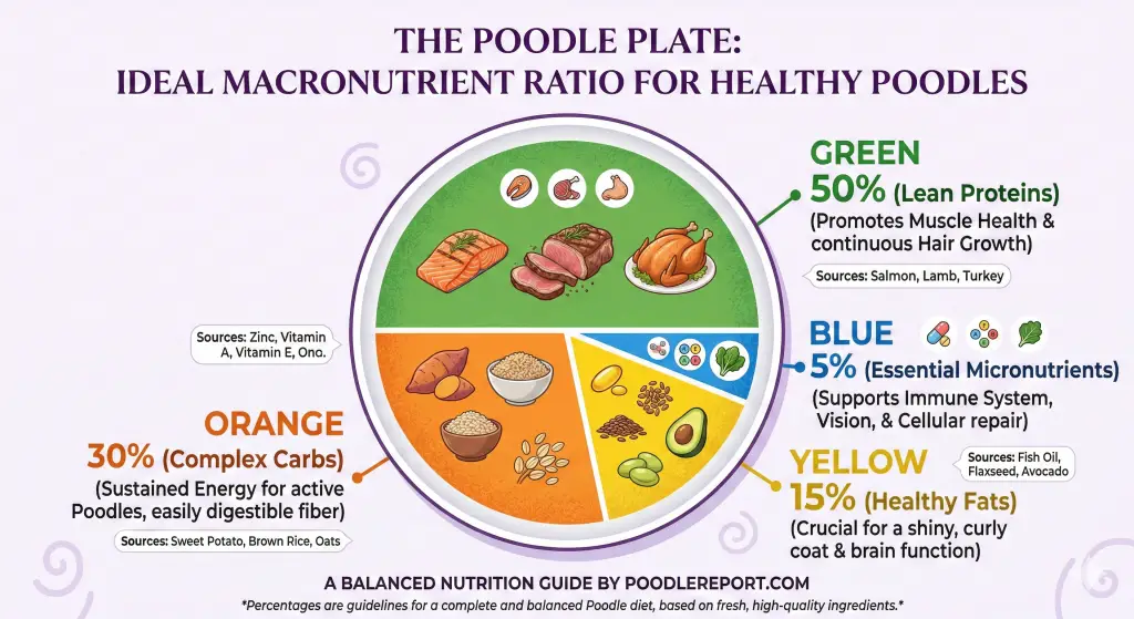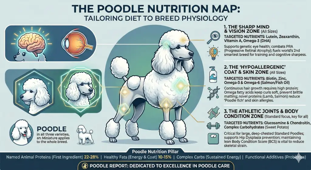 Poodles are high-energy athletes, and protein is the literal building block of their dense, single-layer coats.